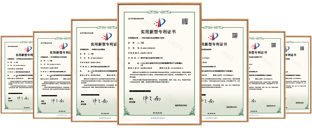 經(jīng)過(guò)多年的研發(fā)創(chuàng)新,湖州開(kāi)森現(xiàn)擁有【一種便攜式散粉盒結(jié)構(gòu)】、【一種多功能化妝品易揭紙卡結(jié)構(gòu)】、【一種方便攜帶的紙卡式粉餅結(jié)構(gòu)】、【一種雙腔混合擠出型化妝品易撕包】、【一種雙腔掰折擠出型化妝品掰折打開(kāi)片】、【一種單腔掰折擠出型化妝品掰折打開(kāi)片證書】等多種專利,可以根據(jù)客戶的不同需求,進(jìn)行深度創(chuàng)新,滿足市場(chǎng)和產(chǎn)品日益更新的需求。